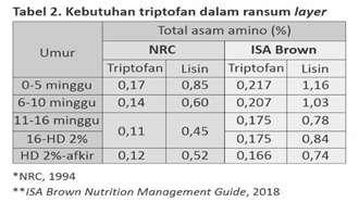 Triptofan merupakan asam amino pembatas keempat setelah lisin, metionin dan treonin. Kandungan triptofan di dalam pakan unggas tidak terlepas dari imbangannya dengan lisin. Rasio optimal triptofan dan lisin berdasarkan rekomendasi National Research Council (1994) dan standar pembibit (breeder) ayam komersil. Rekomendasi triptofan dari breeder lebih tinggi daripada NRC, karena disesuaikan dengan potensi produksi unggas modern yang terus berkembang.