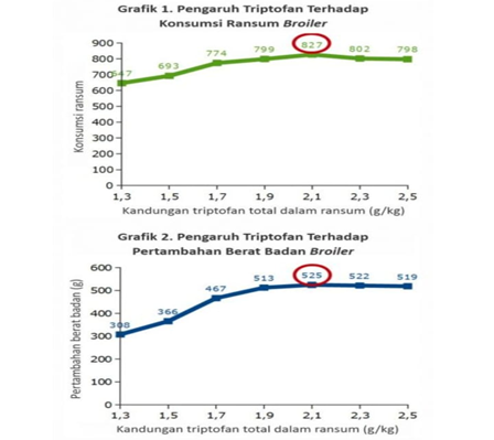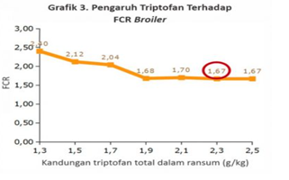 Corzo et al. (2013) dalam penelitiannya membuktikan bahwa meningkatknya kandungan triptofan dalam ransum semakin meningkatkan performa broiler umur 1-20 hari yang dilihat dari konsumsi ransum (Grafik 1), pertambahan berat badan (Grafik 2) dan feed conversion ratio (FCR)-nya (Grafik 3). Triptofan dapat mengoptimalkan performa broiler pada pemberian ransum dengan kandungan triptofan total sebesar 2,1-2,3 g/kg.