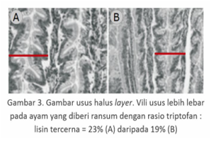 Triptofan dapat mengoptimalkan pencernaan nutrien pakan dengan memperlebar ukuran vili-vili usus halus. Pada Gambar 3 terlihat bahwa meningkatnya rasio tercerna triptofan : lisin mampu meningkatkan lebar vili usus (garis merah), sehingga luas permukaan untuk meyerap nutrien pakan meningkat. Semakin banyak nutrien ransum yang diserap maka performa ayam juga meningkat.